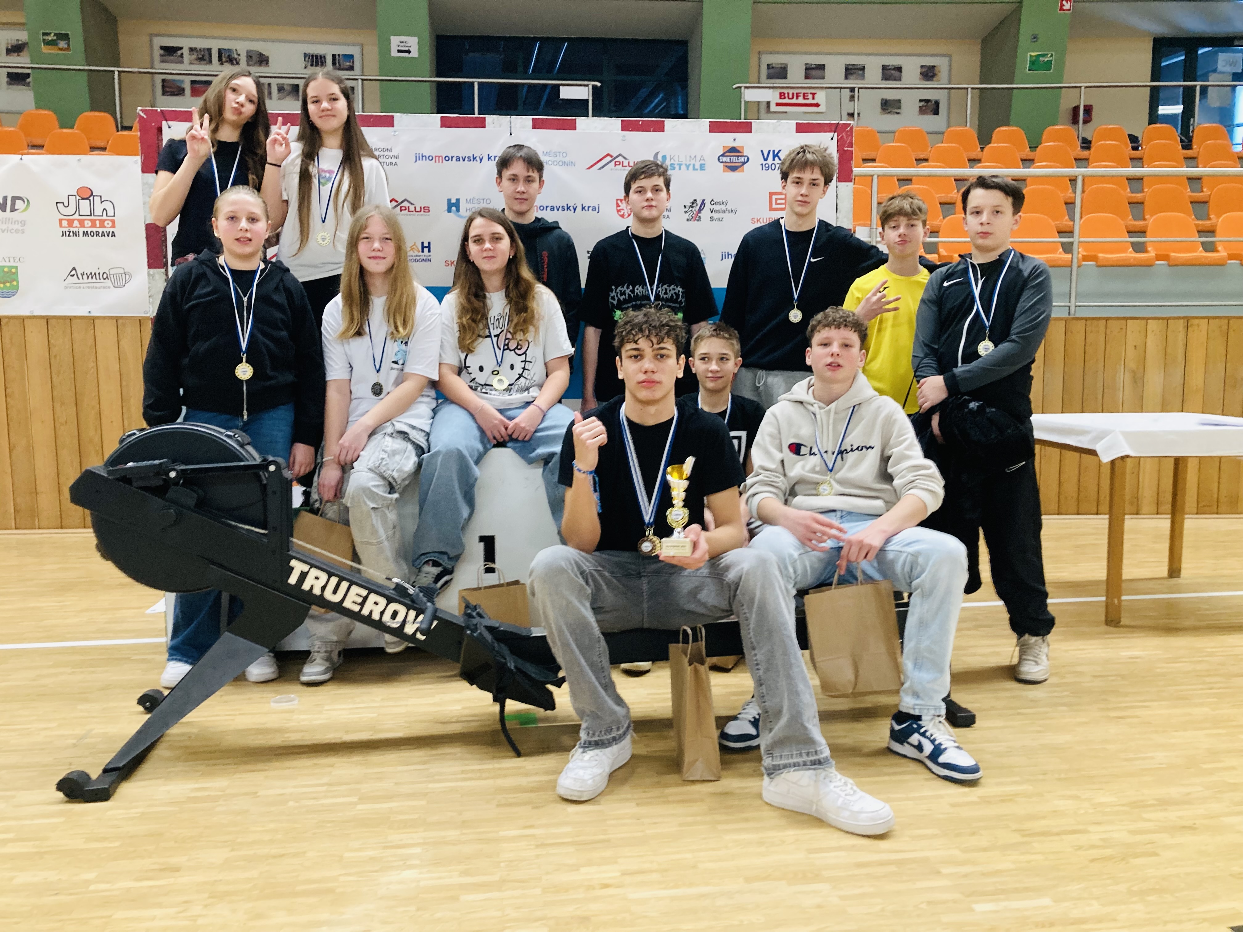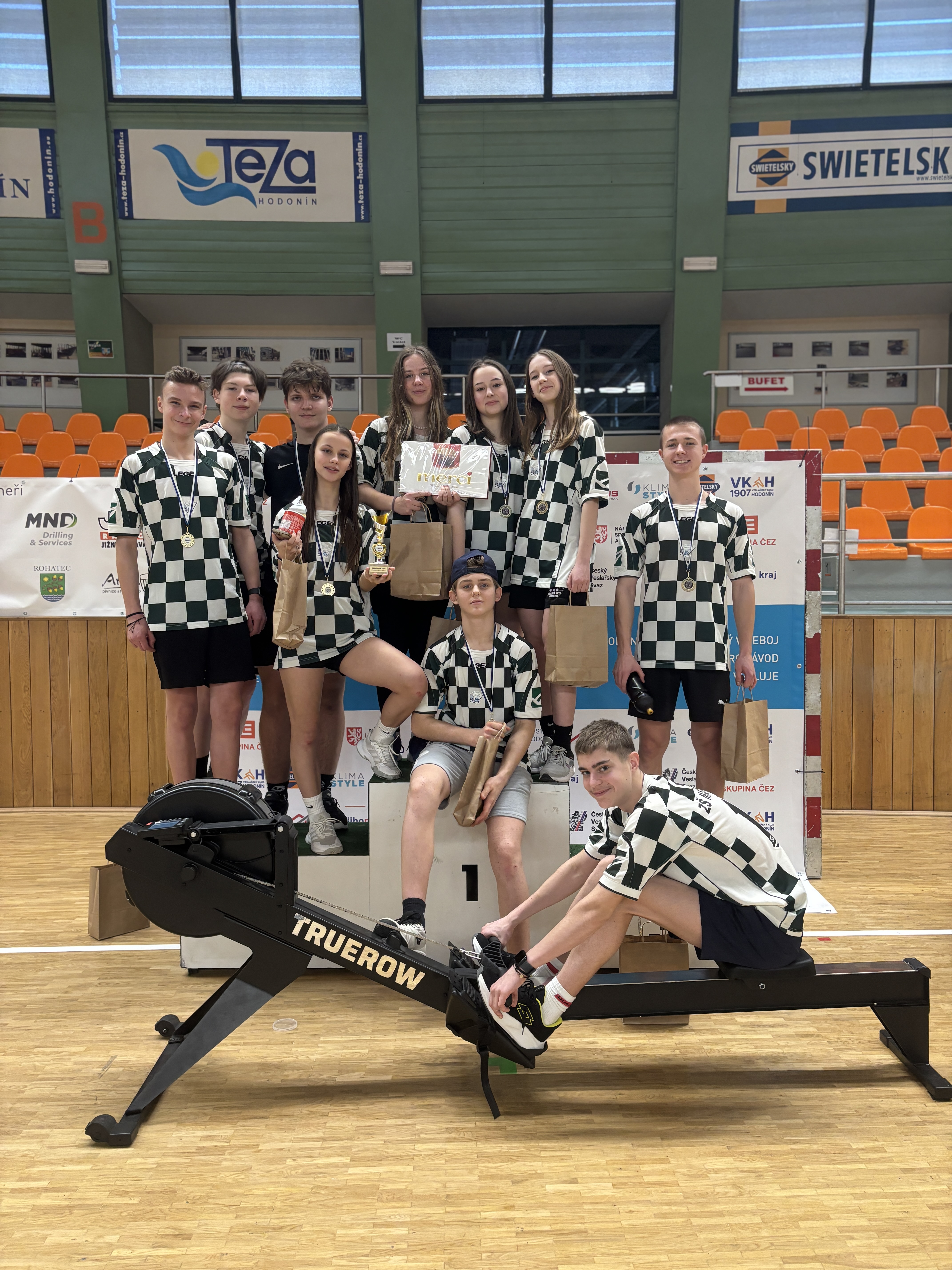Mladší i starší žáci (6.–9. třída) se vrhli do štafetového klání, kde deset členné smíšené týmy bojovaly o co nejrychlejší pokoření 10 000 metrů. Kdo vystřídal plynule, kdo neztratil rytmus a kdo si sáhl na dno? Nebylo to jen o prestiži – hlavní motivací byl nový veslařský trenažer TRUE ROW, připravený jako hlavní cena v každé kategorii. 🚣♂️🏆